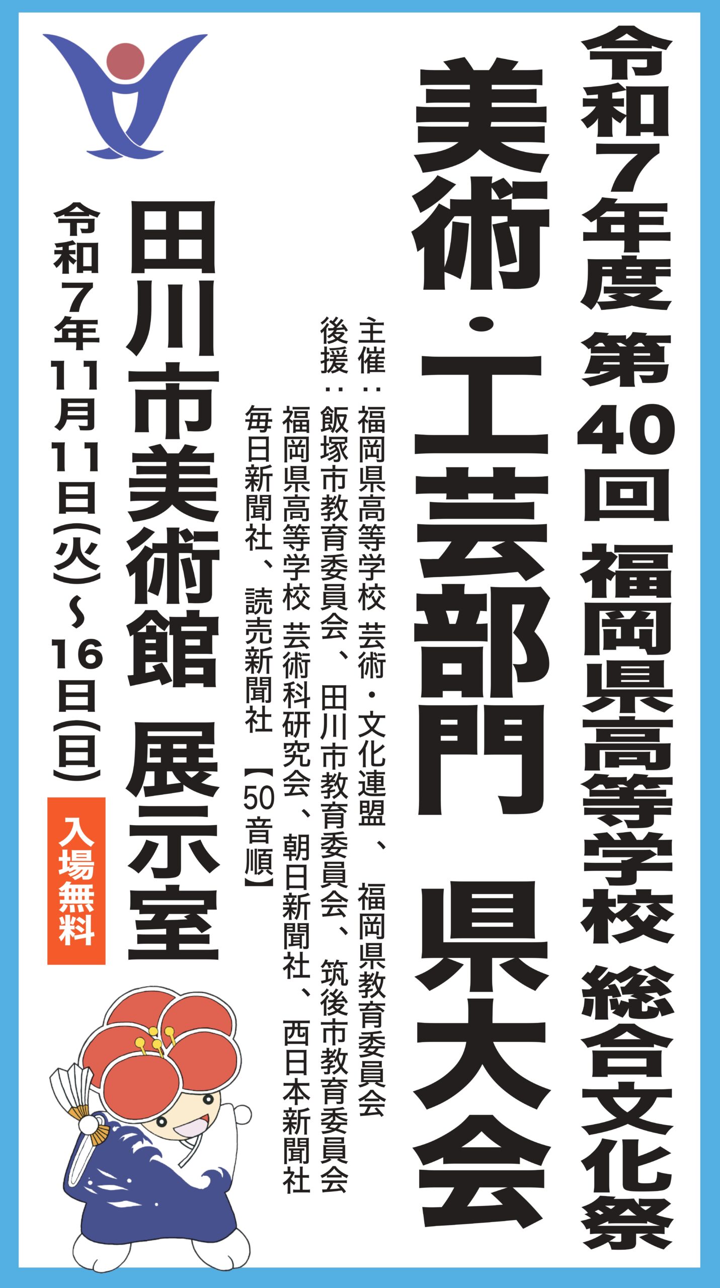 終了 第40回 福岡県高等学校総合文化祭 美術・工芸部門 福岡県大会 2025.11.11~11.16 期間 2025年11月11日(火)〜11月16日(日) 時間 9:30~17:30(入館 17:00まで) ※最終日 9:30〜16:30(入館 16:00まで) 会場 全フロア 観覧料 無料 Post Share RSS