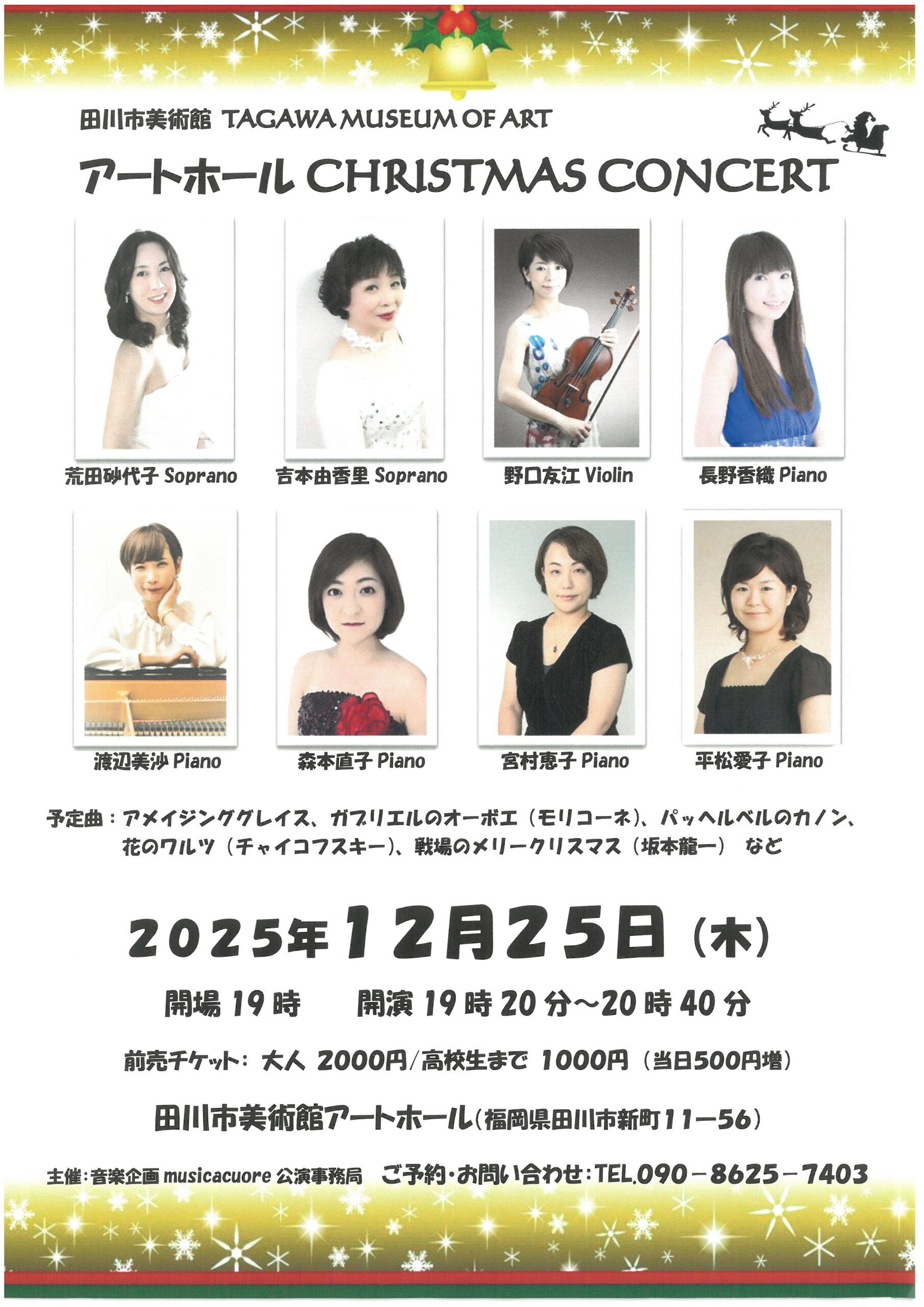 開催中ーこれから アートホール CHRISTMAS CONCERT 2025年12月25日(木) 期日 2025年12月25日(木) 時間 開場 19:00 開演 19:20~20:40 会場 アートホール 観覧料 大人2,000円 高校生まで1,000円 (当日500円増) Post Share RSS