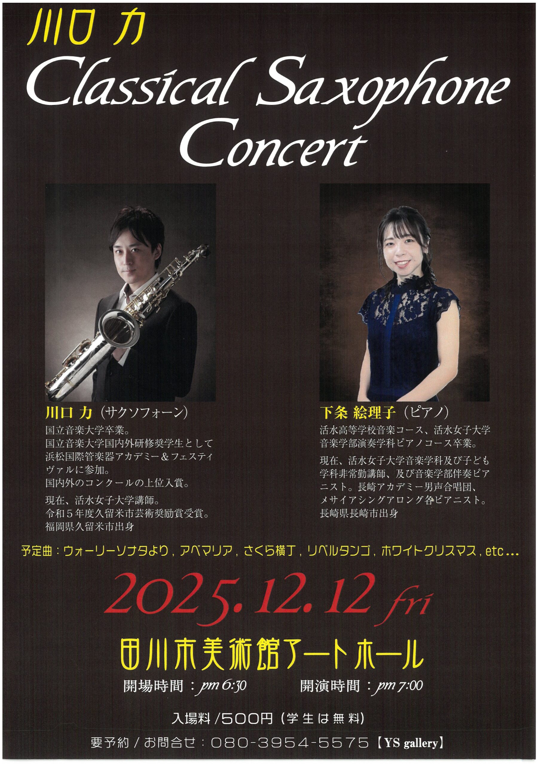 開催中ーこれから 川口力 Classical Saxophone Concert 2025年12月12日(金) 期日 2025年12月12日(金) 時間 開場 18:30 開演 19:00 会場 アートホール 観覧料 一般500円 学生無料 Post Share RSS